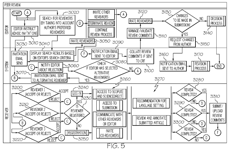 Elsevier filed its patent application on June 28, 2012. The description of the invention is lengthy, but is essentially a description of the process of peer review, but on a computer. For example, it includes a detailed discussion of setting up user accounts, requiring new users to pass a CAPTCHA test, checking to see if the new user’s email address is already associated with an account, receiving submissions, reviewing submissions, sending submissions back for corrections, etc, etc, etc.