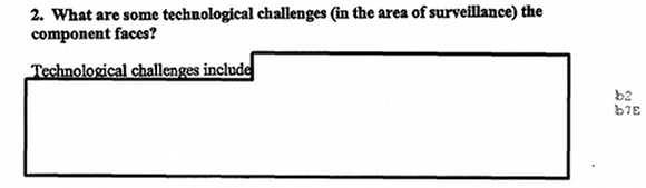 Finally, the FBI has redacted important information from a questionnaire on surveillance activities that appears to have been shared with Congress and was intended to include only “high-level unclassified information.” (Going Dark 59-67)