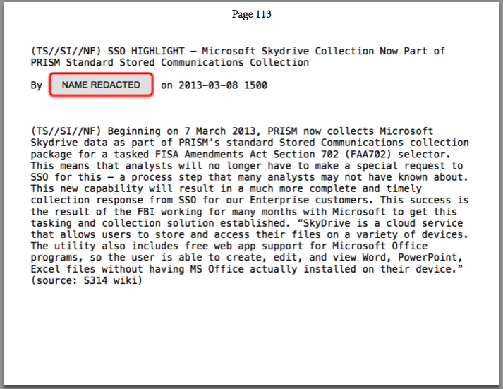 There are also a series of slides describing the FBI’s relationship with Microsoft. One notes that the NSA is now able to collect Microsoft Skydrive data as a “result of the FBI working for many months with Microsoft to get this tasking and collection solution established .” (