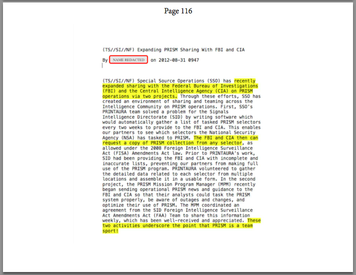 - Information sharing between the FBI, NSA, and CIA has been routinized through “software which would automatically gather a list of tasked PRISM selectors every two weeks to provide to the FBI and CIA.” (