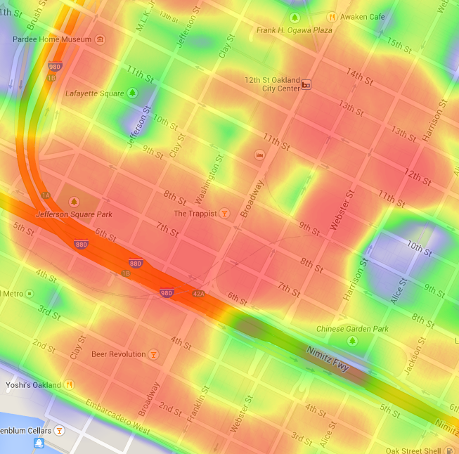Downtown: Oakland PD headquarters is located near the corner of 7th St. and Broadway, so the increased number of hits in this area are likely due to patrol cars traveling to and from police headquarters.