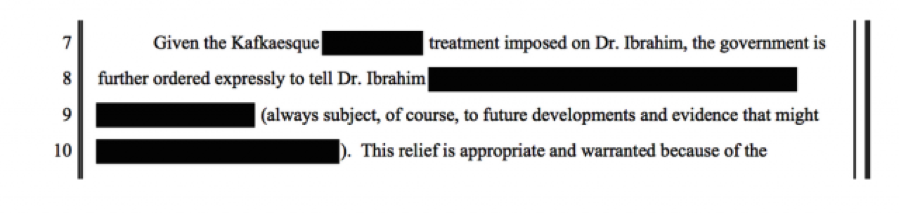 The first is from an infamous "No Fly" case, in which a Malaysian professor, Rahinah Ibrahim, sued to get her name taken off the Department of Homeland Security's No Fly list, since it had wound up there by accident. After an eight-year battle, Ibrahim received a favorable decision from the judge last year. The version of the opinion made public was chockful of redactions, including this deliciously ironic one: