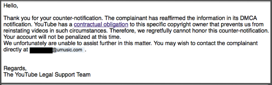 Internet users generally think of YouTube as a platform where, if you play by the copyright rules, the content you post is safe from takedown and, if it's taken down improperly, you have some recourse. But that's not the case, thanks to an additional barrier to lawful sharing: meet YouTube's “contractual obligations.”