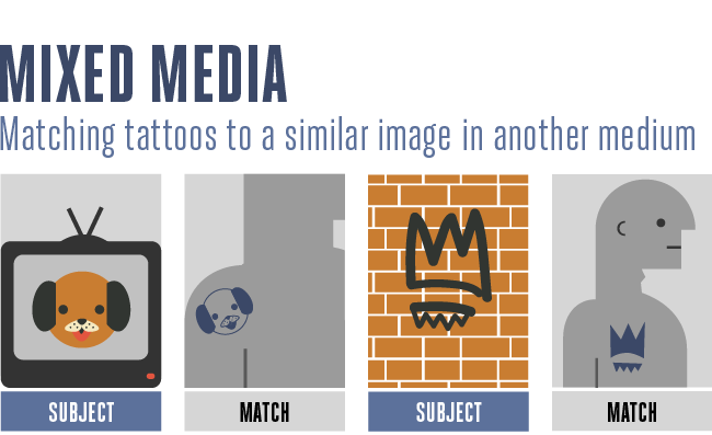 Mixed Media: When you get a tattoo, the artist rarely inks their first draft on your skin. The artist will draw it out on paper, then turn it into a purple transfer to trace out with the needles. The question for researchers is whether an algorithm can reverse engineer this process; rather than matching tattoos to tattoos, can they match a tattoo to an image in another medium.