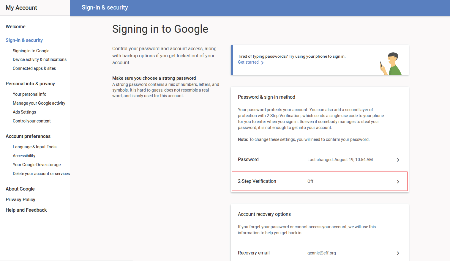 Click on your profile picture in the upper-right hand corner and click “My Account.” From your account page, choose “Sign-in & security.”
