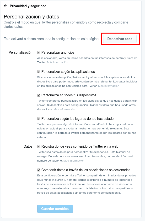 Instead, concerned users have to click “Review settings” to opt out of Twitter’s new mechanisms for user tracking. That will bring you to the “Personalization and Data” section of your settings. Here, you can pick and choose the personalization, data collection, and data sharing you will allow—or, click “Disable all” in the top-right corner to opt out entirely.