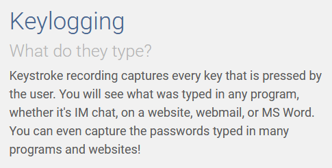 Work Examiner’s description of its Keylogging feature, specifically highlighting its ability to capture private passwords.