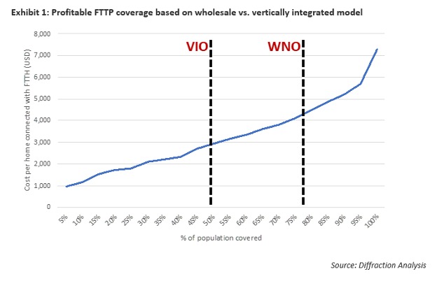 The truth is, with the appropriate amount of patience and a long-term investment strategy, universal fiber access is feasible. Provisioning fiber infrastructure on a wholesale model, which means selling capacity to all comers but not selling broadband service, makes it feasible to build out to large swaths of the United States where symmetrical gigabit and beyond demand exists or will exist in the future. When factoring in all the burdens (and risks) a vertically integrated ISP carries with it today compared to the simplified approach of an infrastructure-only deployment, our cost model shows that an infrastructure-only entity can deliver fiber optic wires to nearly 80% of the population for a profit while vertically integrated ISPs can reach at best only half.