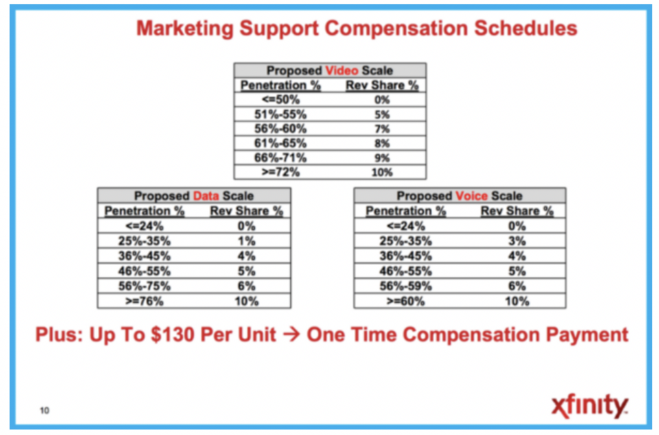 The scheme is relatively straightforward: cable companies pay landlords for each tenant that they can get to subscribe to their particular cable service. The more tenants a landlord delivers to the cable company, the more money the landlord gets paid. That means a portion of a tenants’ cable bill is going to their landlord, on top of the rent they already pay. In fact, Comcast even offers landlords bonus money from the tenants’ cable bills that increases with the number of tenants using Comcast.