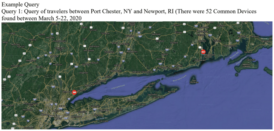 At the end of March 2020, Mark Massop was trying to close a deal to sell Fog Reveal to the Orange County Intelligence Assessment Center (OCIAC), a fusion center directed by staff from the Orange County Sheriff’s Department. As COVID-19 swept through the country, Fog saw an opportunity. New York City experienced high infection rates during the first few weeks of the pandemic, and it made leaders of nearby states nervous about NYC residents traveling and spreading the virus. The governor of Rhode Island had recently proposed banning all travelers from New York. Fog put together a demo for Orange County illustrating how its data could be used to help enforce such a ban.