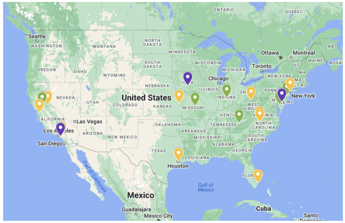 A map of some agencies that have paid for access to Fog’s software, according to purchase orders and other records received by EFF. Green are state-level agencies, yellow are local, and purple are fusion centers.